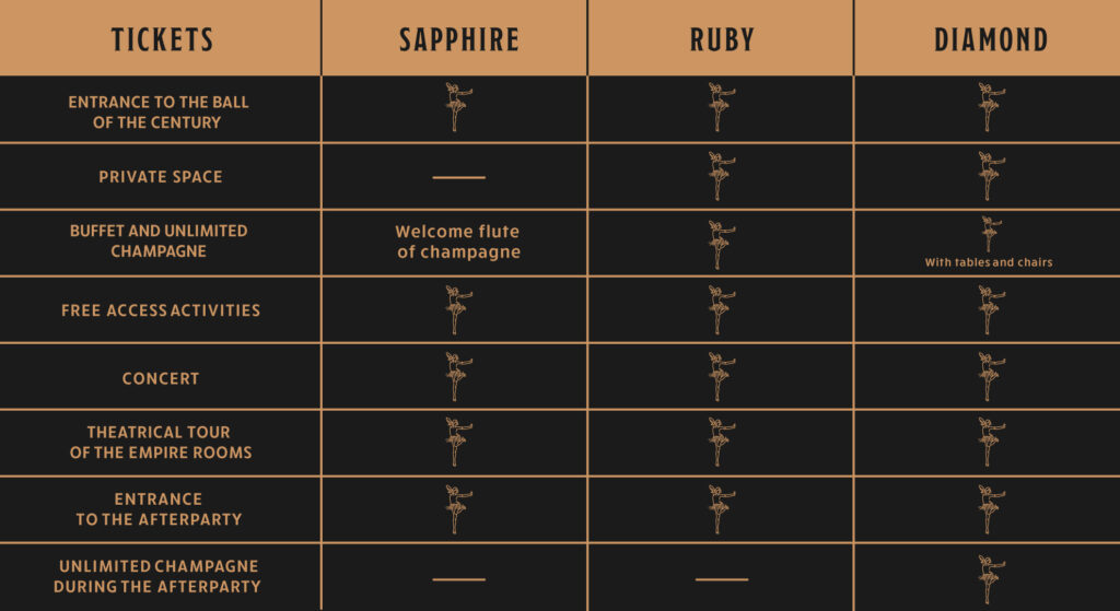– Access to the after-party in the Gallery of the Great Battles from 00:00 to 01:30 (Diamond area open for drinks only).