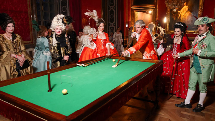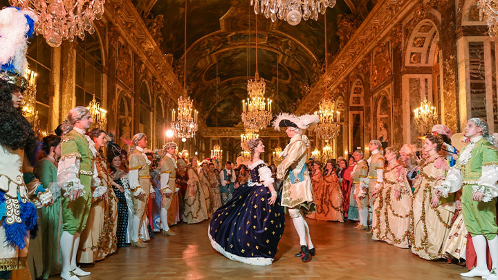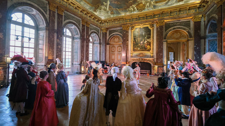 You will be welcomed in the Marble Courtyard with a glass of champagne, to the beat of kettledrums and trumpets. You will then wander throught the Grand Apartments, where sketches, historical games and demonstrations will transport you back to the splendour of the Sun King’s court festivities, amidst the elegant, artistic atmosphere of the famed “Soirée d’Apartements”.