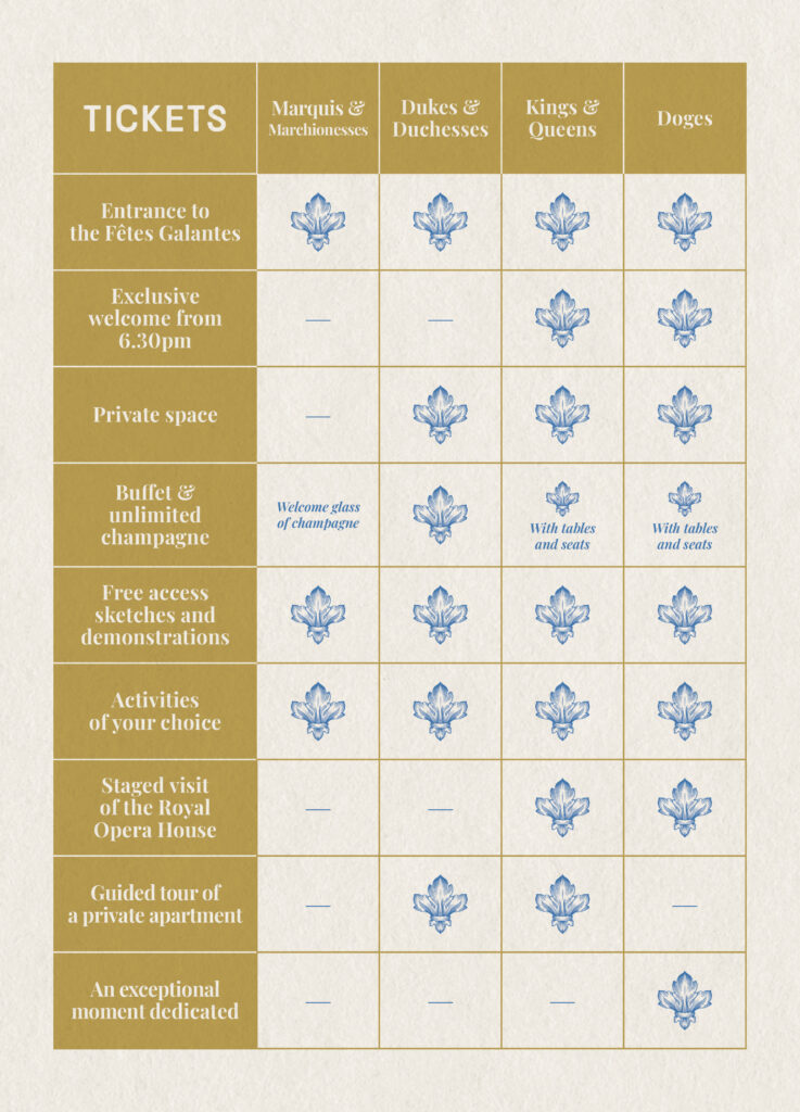 Make your selection at the time of purchase and enjoy two exclusive activities setting the tones for your evening, before rejoining the Grand Ball held in the stunning Hall of Mirrors at 11 p.m.
