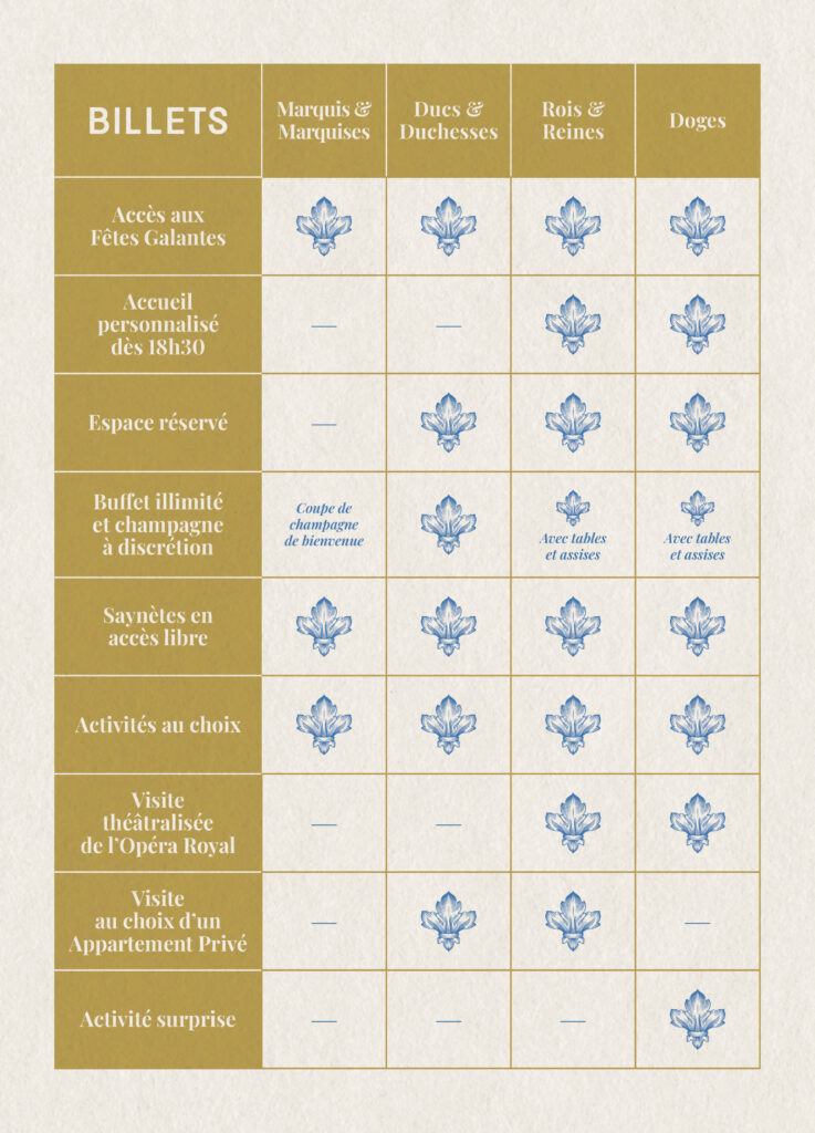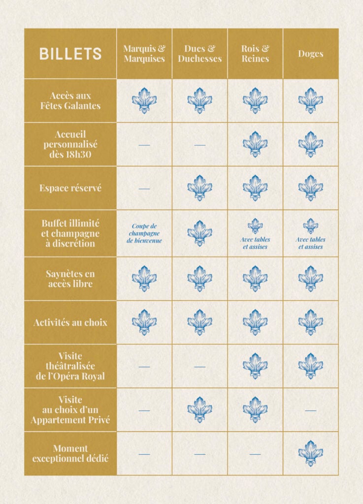 Au rythme des timbales et trompettes, vous serez accueilli en Cour de Marbre avec une coupe de champagne de bienvenue. Vous déambulerez ensuite dans les Grands Appartements, où saynètes, jeux d’époque et animations vous feront revivre la splendeur des fêtes à la cour du Roi Soleil dans l’atmosphère raffinée et artistique des légendaires Soirées d’Appartement.