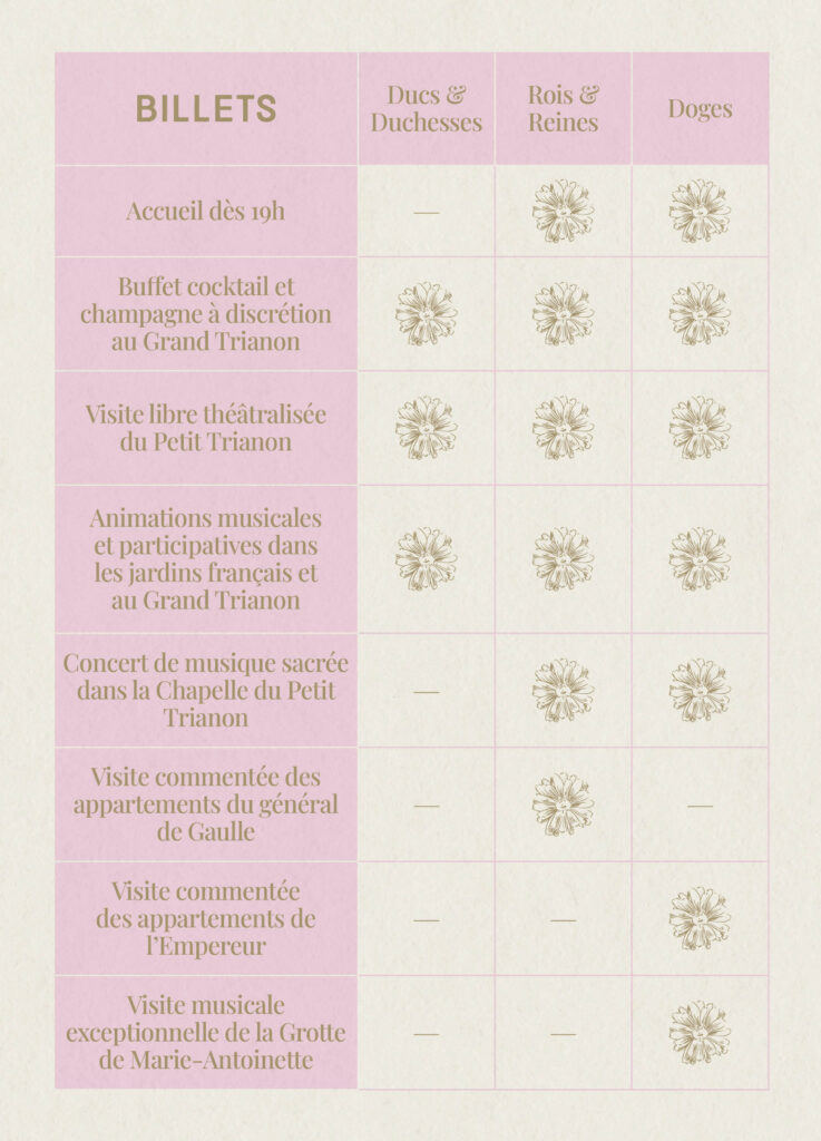 Entre le raffinement néoclassique du Petit Trianon et la splendeur du Grand Trianon, les convives seront conviés à des divertissements mondains, des intermèdes musicaux, et des visites confidentielles, évoquant les plaisirs délicats et la liberté d’esprit chère à Marie-Antoinette et ses proches.
